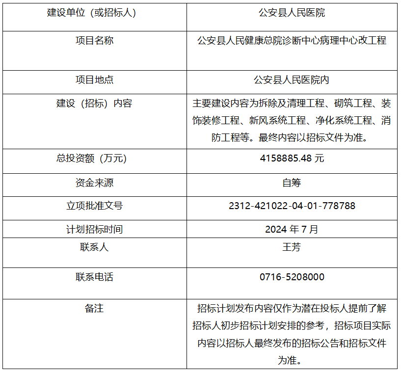 公安县人民健康总院诊断中心病理中心改建工程招标计划预公告